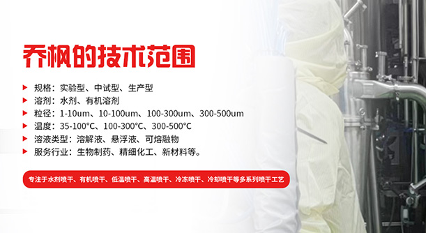 上海喬楓實業(yè)有限公司,成立于2012年,是從事噴霧干燥設備的研發(fā)設計、生產(chǎn)、銷售(小型噴霧干燥機,實驗型噴霧干燥機,35℃低溫噴霧干燥機,有機溶劑噴霧干燥機低溫閉式循環(huán)噴霧干燥機超細粉末噴霧干燥機、噴霧冷凍干燥機、真空噴霧干燥機氣流噴霧干燥機噴霧造粒干燥機,離心噴霧干燥機,沸騰制粒機等)和售后于一體的綜合性公司,本公司現(xiàn)成為一家致力于為生物制藥、精細化工、新能源、陶瓷造粒及食品工程等領(lǐng)域提供全套解決方案的整線交鑰匙工程企業(yè)。